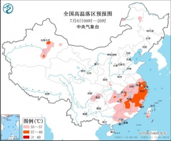全國(guó)高溫落區(qū)預(yù)報(bào)圖(7月6日08時(shí)-20時(shí)) 圖源:中央氣象臺(tái)網(wǎng)站