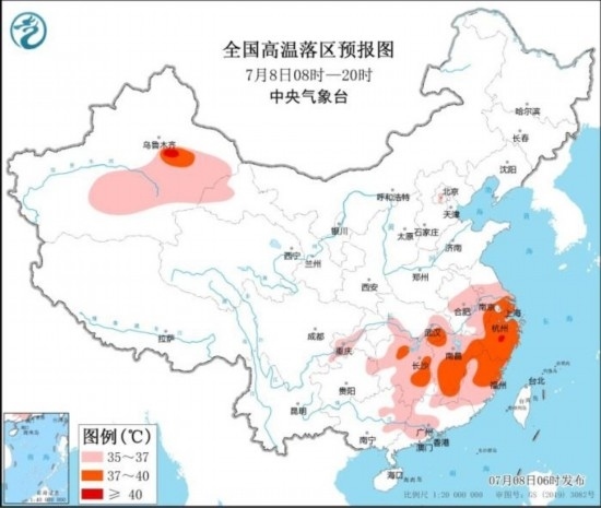 全國高溫落區(qū)預報圖(7月8日08時-20時)
