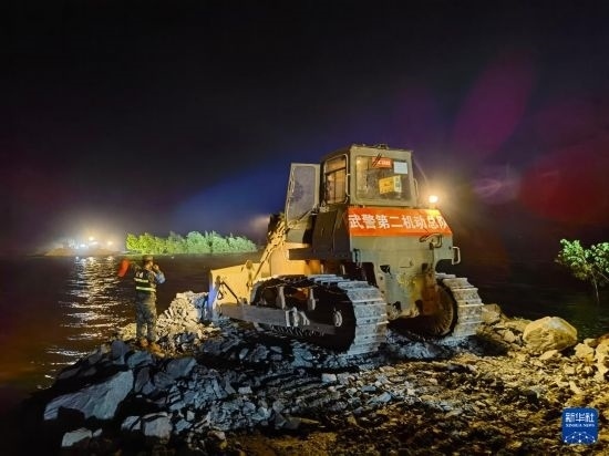 7月7日凌晨,在湖南省岳陽(yáng)市華容縣團(tuán)洲垸洞庭湖一線(xiàn)堤防決口處,武警部隊(duì)官兵操縱工程機(jī)械封堵決口。