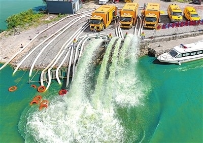在浙江省臺州市防汛防臺綜合應(yīng)急演練中,市政強排車進行作業(yè)。孫金標(biāo)攝(人民圖片)