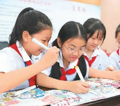 浙江省臺(tái)州市路橋區(qū)螺洋小學(xué)的學(xué)生繪制網(wǎng)絡(luò)安全宣傳手抄報(bào)。蔣友青攝(人民視覺(jué))