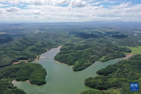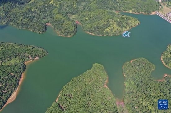 這是江西省撫州市臨川區(qū)秋溪鎮(zhèn)溪山湖水庫(kù)(7月25日攝,無(wú)人機(jī)照片)。