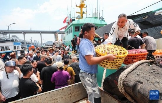 當日,在浙江省舟山市普陀區(qū)舟山國際水產(chǎn)城碼頭,出海的漁船歸來,商戶們聞“鮮”而至。工人把卸下來的梭子蟹運往水產(chǎn)城內(nèi),準備銷往各地市場。
