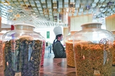 北京同仁堂知嘛健康零號店餐廳內(nèi)擺放的草本食材。新華社發(fā)
