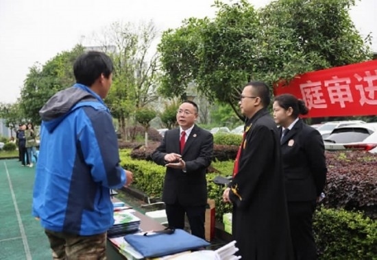 圖為重慶市渝北區(qū)人民法院在一起到企業(yè)現(xiàn)場開庭的勞動爭議案結(jié)束后,為勞動者普及法律知識、提供法律咨詢。 劉霞 攝