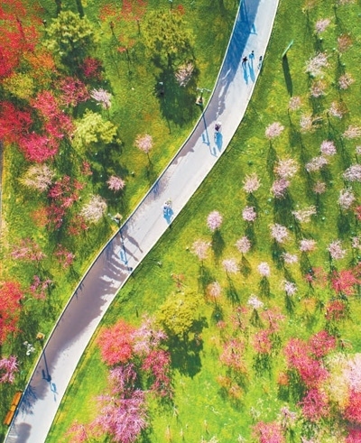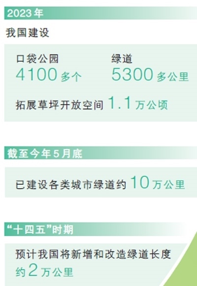 我國將綠色發(fā)展理念融入城鄉(xiāng)規(guī)劃建設(shè)管理中,穩(wěn)步推進(jìn)建設(shè)連通區(qū)域、城市、社區(qū)的城鄉(xiāng)綠道體系。2023年,我國建設(shè)口袋公園4100多個、綠道5300多公里,拓展草坪開放空間1.1萬公頃,截至今年5月底,已建設(shè)各類城市綠道約10萬公里。