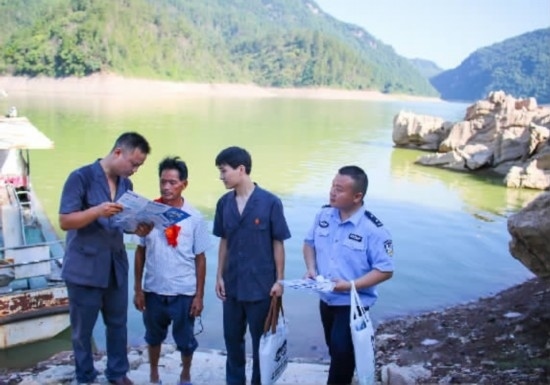 圖③:干警向兩岸過渡村民發(fā)放普法資料,并提醒他們乘船時注意安全。
