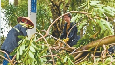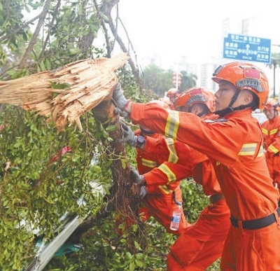 9月7日,海南省??谑泄ぷ魅藛T在海口市濱海大道上清理被風吹倒的樹木。新華社記者 楊冠宇攝