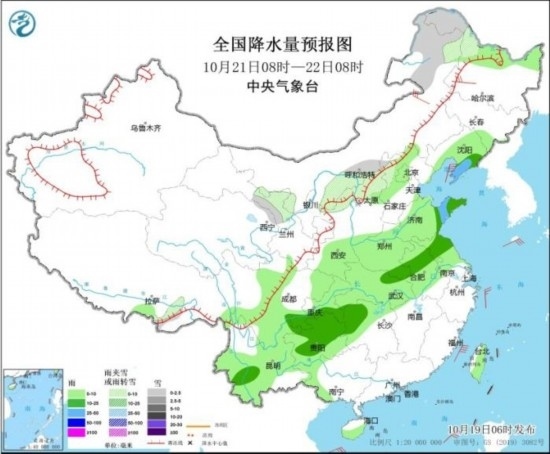 10月21日08時至22日08時,內蒙古河套地區(qū)和東北部、黑龍江西北部、甘肅河西、寧夏北部、陜西北部、山西北部、河北北部等地部分地區(qū)有小雪或雨夾雪。黑龍江北部、吉林南部、遼寧大部、陜西北部、黃淮、江淮大部、江漢、江南北部、西南地區(qū)大部、廣西西北部、海南島南部、臺灣島大部等地部分地區(qū)有小到中雨,其中,遼寧東部和南部、山東半島等地部分地區(qū)有大雨。內蒙古中部、黑龍江西南部等地部分地區(qū)有5~6級風。