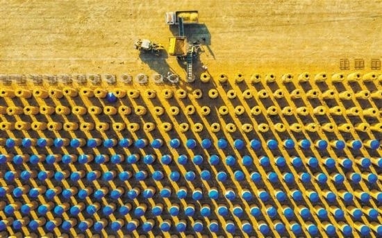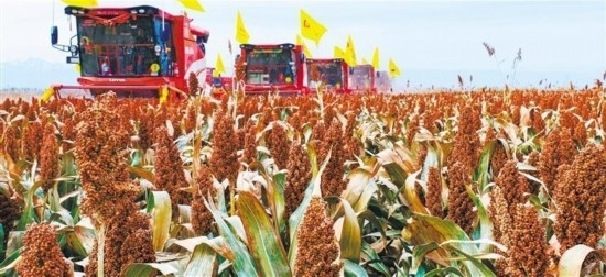 10月16日,甘肅省張掖市民樂縣有機紅高粱種植基地,大型收割機在收割高粱。王 將攝(中經(jīng)視覺)