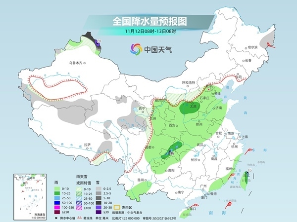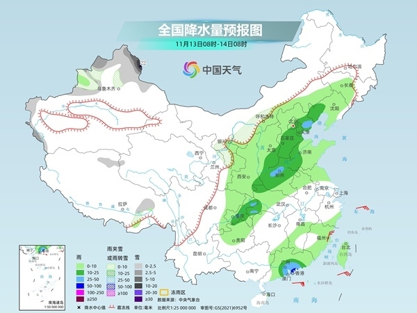 明天,內(nèi)蒙古河套地區(qū)、新疆北疆北部和北疆東部、西藏東部和北部、寧夏中北部、陜西北部等地部分地區(qū)有小到中雪或雨夾雪,其中,新疆北疆東部等地部分地區(qū)有大到暴雪,局地大暴雪(20~22毫米)。遼寧西部、華北中北部和南部、黃淮東部和西部、重慶中部、華南南部等地部分地區(qū)有中到大雨,其中,廣東東南部沿海等地部分地區(qū)有暴雨。