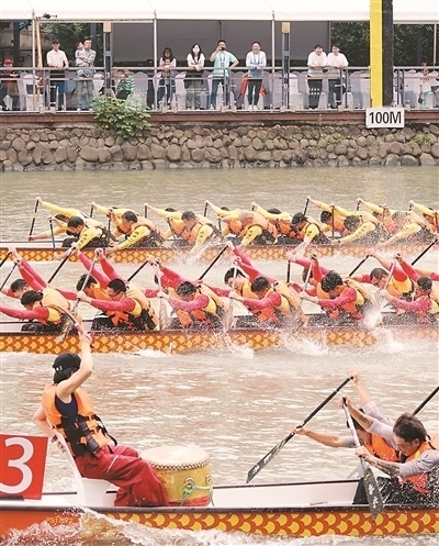 6月1日,第二十屆上海蘇州河城市龍舟邀請賽比賽現(xiàn)場,選手在激烈比拼。馬偉勤攝(人民視覺)