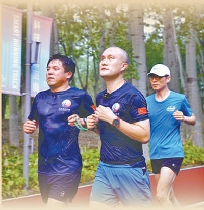 在公園步道上,身著印有“助盲”和“視障”字樣服裝的跑者。郭旭鵬攝