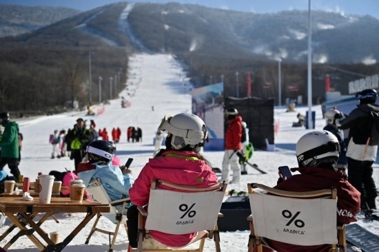 11月23日,滑雪愛好者在吉林市北大湖滑雪度假區(qū)的休息區(qū)喝咖啡。新華社記者 顏麟蘊 攝