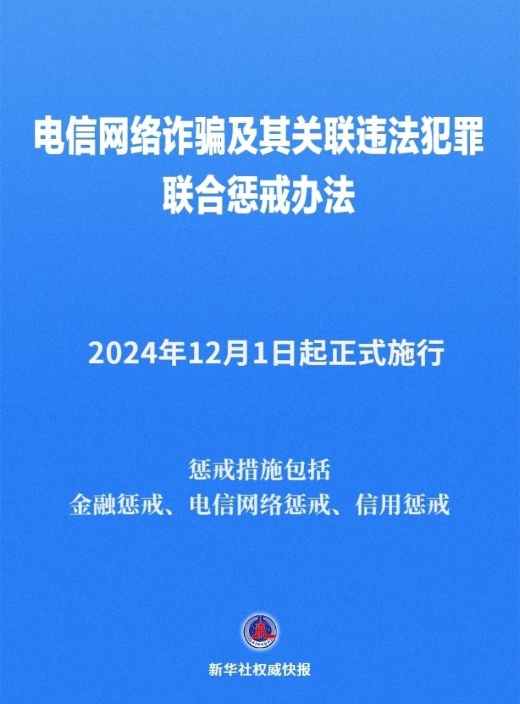 公安部11月26日召開新聞發(fā)布會(huì),介紹公安部會(huì)同國家發(fā)展和改革委員會(huì)、工業(yè)和信息化部、中國人民銀行聯(lián)合印發(fā)《電信網(wǎng)絡(luò)詐騙及其關(guān)聯(lián)違法犯罪聯(lián)合懲戒辦法》,2024年12月1日起正式施行。