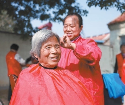 德化人心山東省東營市廣饒縣開展形式多樣的活動,弘揚愛老敬老的優(yōu)良傳統(tǒng)。圖為在廣饒縣李鵲鎮(zhèn)趙寺村,志愿者為老人理發(fā)。劉云杰攝(影像中國)