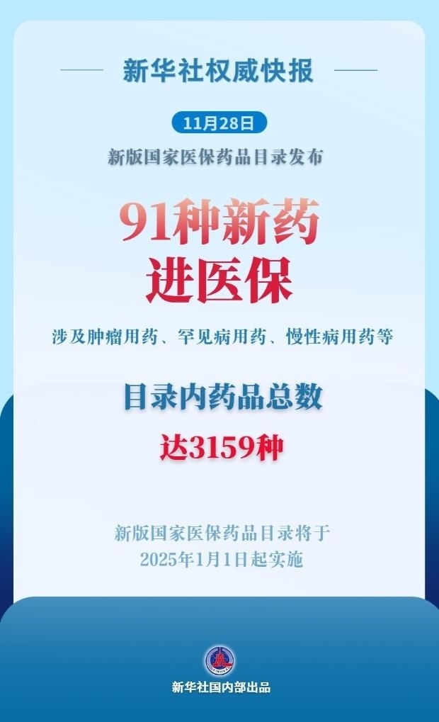 自成立以來,國家醫(yī)保局已連續(xù)7年開展醫(yī)保藥品目錄調(diào)整工作。本次調(diào)整后,目錄內(nèi)藥品總數(shù)將增至3159種,腫瘤、慢性病、罕見病、兒童用藥等領(lǐng)域的保障水平得到提升。新版國家醫(yī)保藥品目錄將于2025年1月1日起實(shí)施。