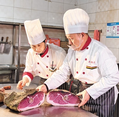 宣威市存香飯店,大廚徐天勇正忙著挑選食材,而烏金豬是制作宣威火腿的最佳原料。“腌制過(guò)程也很重要,鹽的比例要恰到好處,多一分則咸,少一分則不夠味,經(jīng)過(guò)兩三年發(fā)酵,火腿就可以達(dá)到生吃的標(biāo)準(zhǔn)了?!毙焯煊掠霉轻樰p輕插入火腿的上、中、下部,火腿肉質(zhì)清香撲鼻,“就是它了?!?/p>