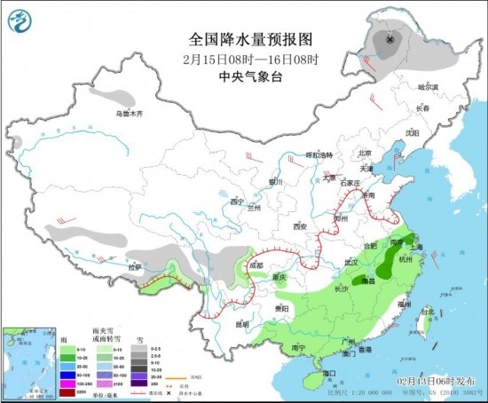 2月15日08時(shí)至16日08時(shí),內(nèi)蒙古東部、黑龍江北部、新疆沿天山地區(qū)、西藏中東部、川西高原中東部等地部分地區(qū)有小雪或雨夾雪,其中,內(nèi)蒙古東北部局地有中到大雪(5~7毫米)。重慶、貴州東部、云南東南部、湖南中南部、湖北東南部、江西、安徽南部、江蘇南部、浙江、福建西部、廣東大部、廣西、海南島、臺(tái)灣島東部等地部分地區(qū)有小到中雨。內(nèi)蒙古、華北地區(qū)北部、西藏中北部等地部分地區(qū)有4~6級(jí)風(fēng);渤海、東海等海域有6~7級(jí)風(fēng)。