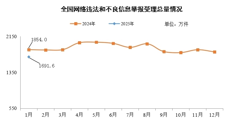 中央網(wǎng)信辦舉報中心2月17日公布的數(shù)據(jù)顯示,2025年1月,中央網(wǎng)信辦舉報中心指導(dǎo)全國各級網(wǎng)信舉報工作部門、主要網(wǎng)站平臺受理網(wǎng)民舉報色情、賭博、侵權(quán)、謠言等違法和不良信息1691.6萬件,環(huán)比下降6.2%、同比下降8.8%。