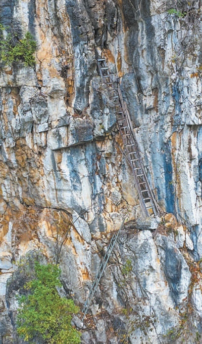 第三條路被村民們稱作“天路”。這是一段垂直高度200米的懸崖峭壁,大約1小時(shí)就能抵達(dá)山頂,但全程需要沿峭壁攀爬。“爬的時(shí)候根本不敢往下看,只有初中的大孩子偶爾會(huì)在家長(zhǎng)帶領(lǐng)下走這條路。”錢慶輝說(shuō)。