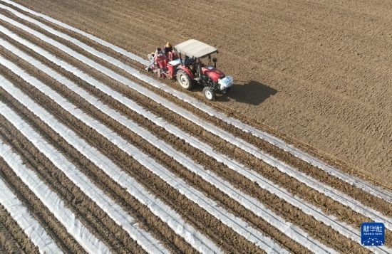 2月26日,河北省新樂市東王鎮(zhèn)的農(nóng)民使用農(nóng)機(jī)播種馬鈴薯(無人機(jī)照片)。