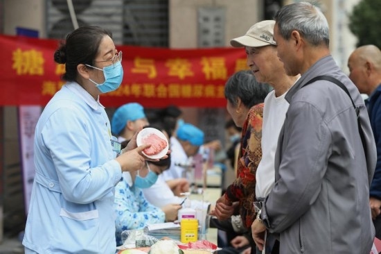 2024年11月14日在浙江省嘉興市南湖區(qū)南湖街道文星社區(qū),海警醫(yī)院護士為居民進行健康飲食指導。新華社發(fā)(金鵬攝)