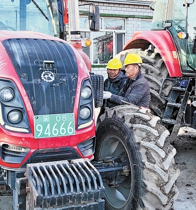 農(nóng)機庫里,社員程傳寶蹲在拖拉機旁仔細檢查,反復(fù)確認有沒有漏油,或者零件松動。