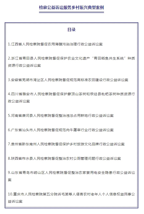 最高人民檢察院3月27日發(fā)布了一批檢察公益訴訟服務鄉(xiāng)村振興典型案例。這10件典型案例涉及耕地保護、農(nóng)村農(nóng)業(yè)文化遺產(chǎn)傳承、農(nóng)村人居環(huán)境改善、農(nóng)村安全生產(chǎn)、農(nóng)村特殊人群權(quán)益保護等方面,展現(xiàn)了檢察公益訴訟工作在服務鄉(xiāng)村振興各個方面所發(fā)揮的積極作用。
