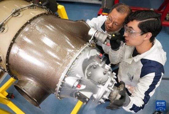 在香港專(zhuān)業(yè)教育學(xué)院,黃富東(右)在檢查渦輪螺旋槳飛機(jī)引擎(1月14日攝)。新華社發(fā)(王申攝)