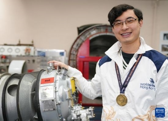 在香港專(zhuān)業(yè)教育學(xué)院,黃富東佩戴著“2024年里昂世界技能大賽”飛機(jī)維修項(xiàng)目的銅牌和渦輪螺旋槳飛機(jī)引擎合影(1月14日攝)。新華社發(fā)(王申攝)