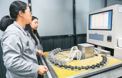 加強食品安全監(jiān)管,為冷鏈設(shè)備制造企業(yè)帶來了發(fā)展機遇。圖為西科冷鏈江門制造基地的產(chǎn)品實驗室工程師在進行電子元件耐用性測試。