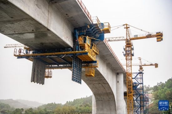4月12日,工人在成渝中線高鐵玄天湖雙線大橋建設(shè)現(xiàn)場施工作業(yè)。