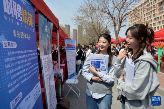 4月11日,學(xué)生在山東青島科技大學(xué)2025年春季綜合類大型雙選會(huì)招聘活動(dòng)現(xiàn)場(chǎng)查看企業(yè)資料。