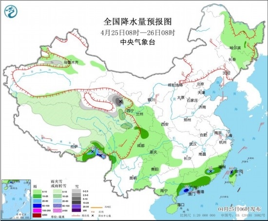 4月25日08時(shí)至26日08時(shí),新疆沿天山地區(qū)和南疆南部、西藏北部和東部、青海大部、甘肅南部、川西高原北部等地部分地區(qū)有小到中雪或雨夾雪,局地有大雪(5~8毫米)。西藏東南部、四川盆地西北部、云南西北部、福建中南部、廣東南部、臺(tái)灣島北部等地部分地區(qū)有中到大雨,其中,西藏東南部、廣東西南部、臺(tái)灣島西北部等地部分地區(qū)有暴雨(50~75毫米)。內(nèi)蒙古中東部、黑龍江東部、遼寧大部、江蘇南部、西藏南部、川西高原北部等地部分地區(qū)有4~5級(jí)風(fēng);東海大部海域、臺(tái)灣海峽有5~7級(jí)風(fēng),陣風(fēng)8級(jí)。