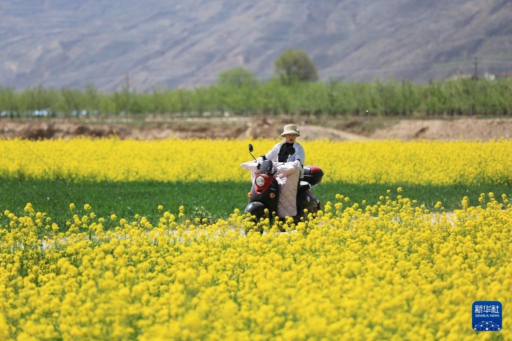 4月25日,在位于黃土高原的甘肅省天水市武山縣,當(dāng)?shù)卮迕耱T行經(jīng)過油菜花田。