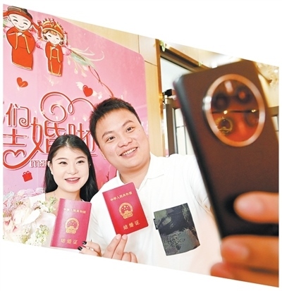 一對(duì)新人在河北邯鄲峰峰礦區(qū)婚姻登記服務(wù)中心自拍留念。