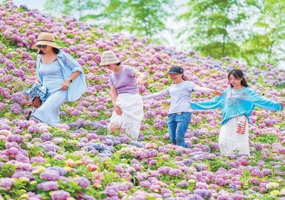 浙江紹興古筑村繡球花綻放,環(huán)境優(yōu)美,吸引眾多游客前來(lái)賞花。
