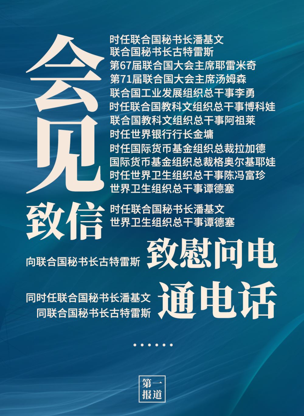 2013年以來,習(xí)主席通過會見、通話、致信函等多種方式同聯(lián)合國主要官員保持密切溝通?;訉ο蟀?lián)合國秘書長、聯(lián)合國大會主席,還有聯(lián)合國工業(yè)發(fā)展組織、聯(lián)合國教科文組織、世界銀行、國際貨幣基金組織、世界衛(wèi)生組織等聯(lián)合國專門機(jī)構(gòu)主要負(fù)責(zé)人。