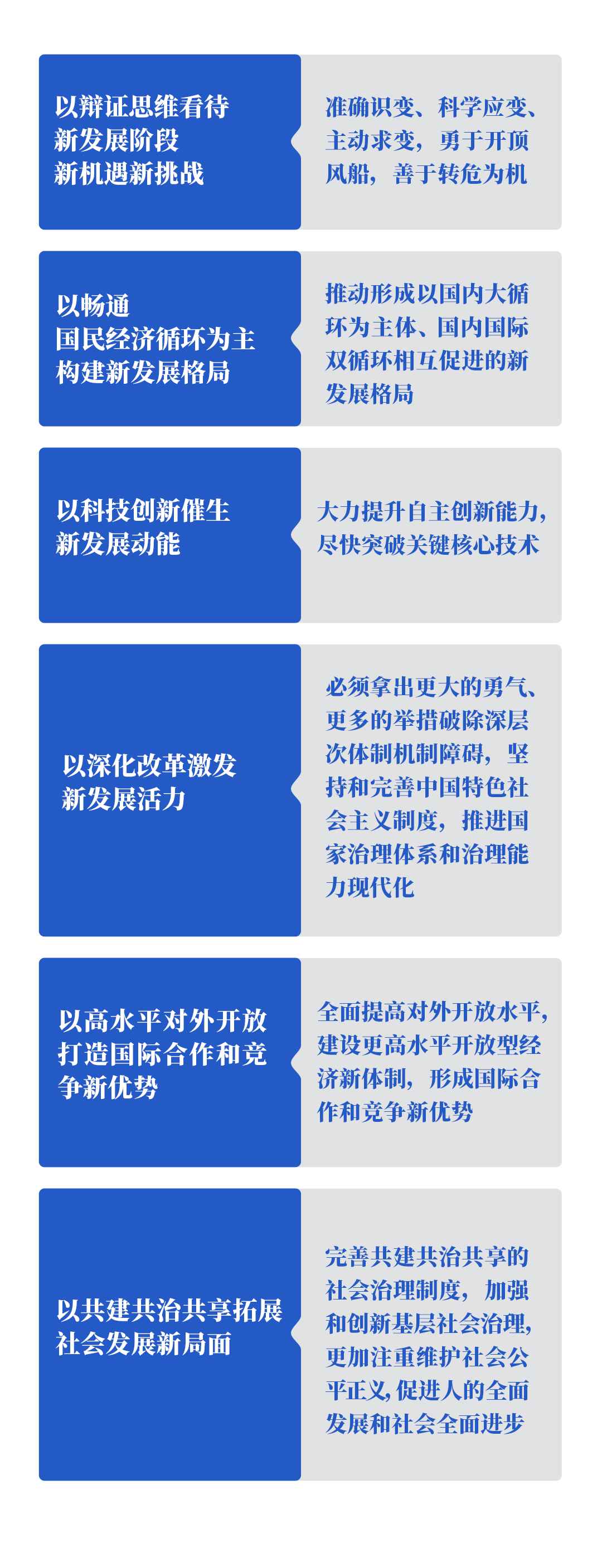 在經(jīng)濟社會領(lǐng)域?qū)<易剷?,?xí)近平從黨和國家事業(yè)發(fā)展的戰(zhàn)略全局出發(fā),從新發(fā)展階段、新發(fā)展格局、新發(fā)展動能、新發(fā)展活力、國際合作和競爭新優(yōu)勢、社會發(fā)展新局面等方面提出要求。這六點要求為正確認識和把握中長期經(jīng)濟社會發(fā)展重大問題指明了方向,是“十四五”規(guī)劃編制和未來經(jīng)濟社會發(fā)展的重要遵循。