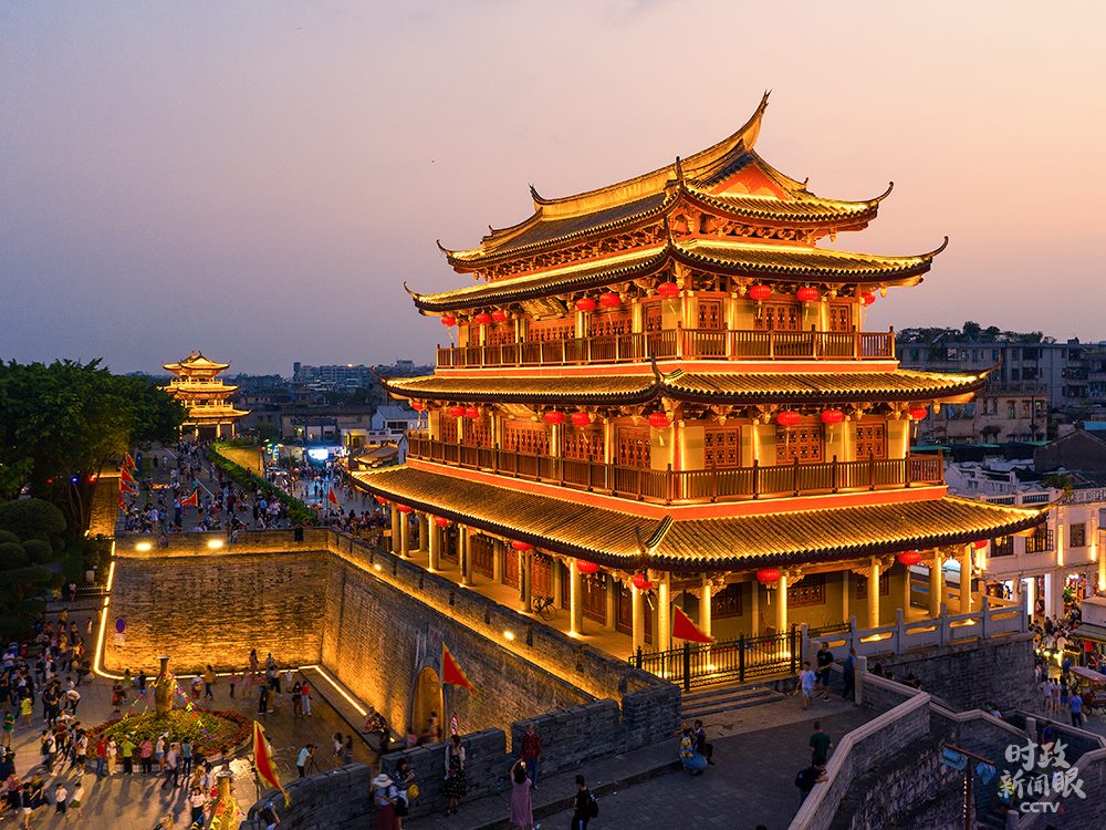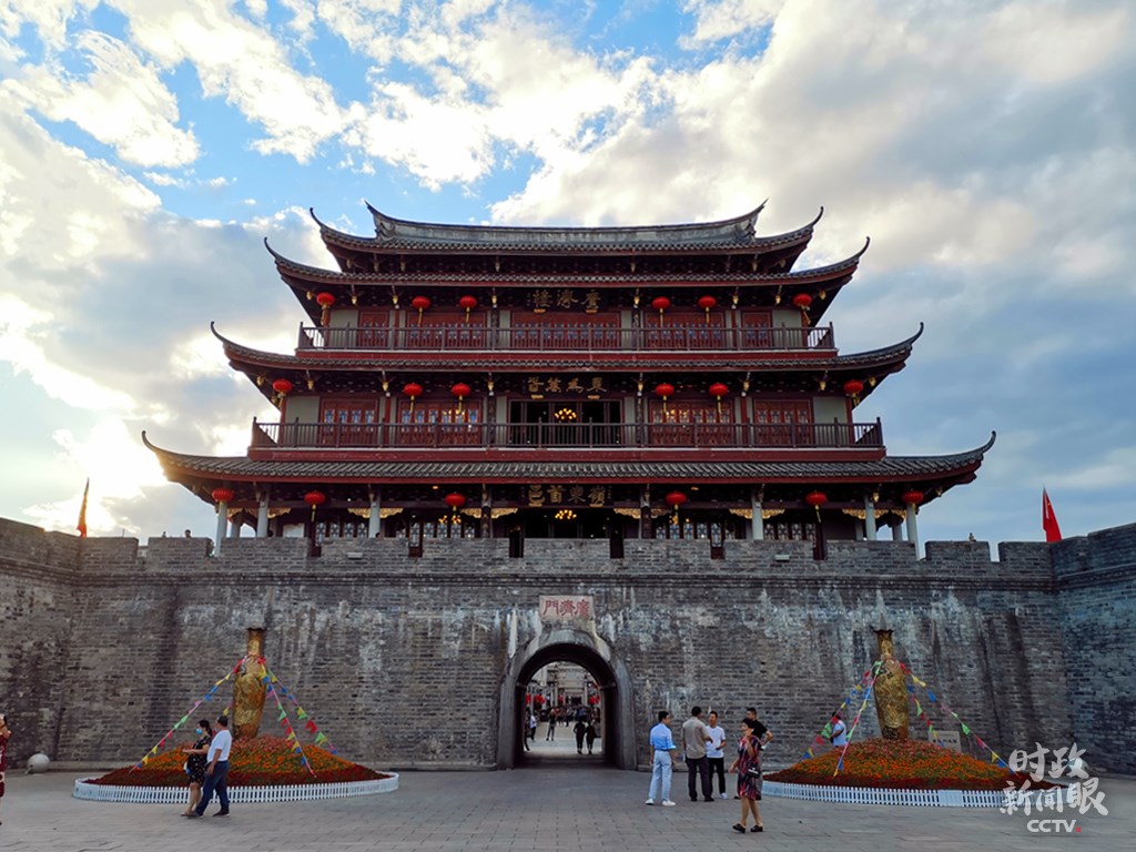 △修復(fù)后的廣濟(jì)門(mén)城樓高24.5米,城樓上的“東為萬(wàn)春”和“嶺東首邑”分別由國(guó)際漢學(xué)大師饒宗頤、書(shū)法家劉炳森題寫(xiě)。(總臺(tái)央視記者楊立峰拍攝)