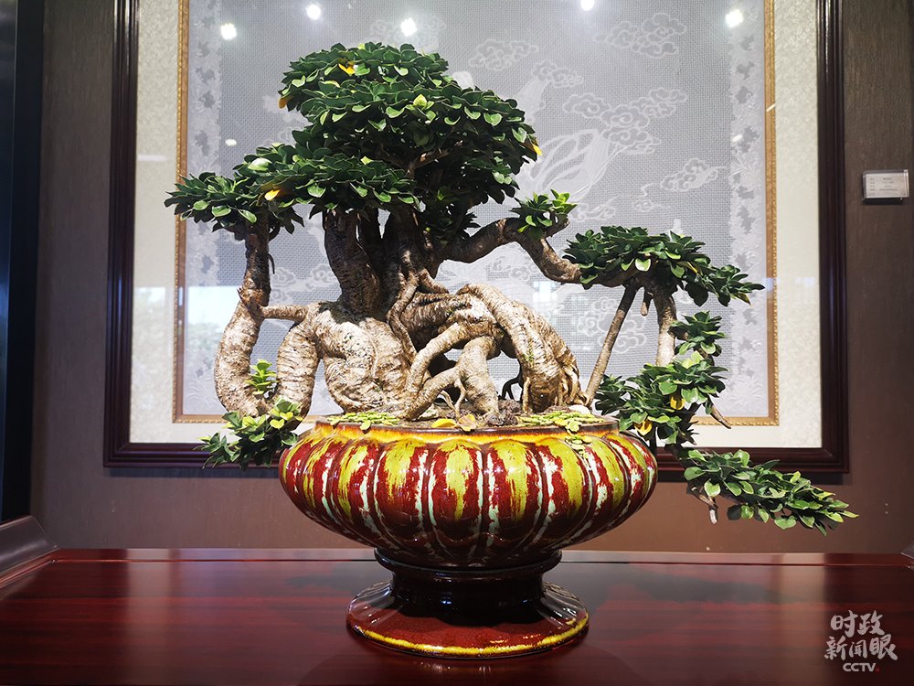 △楓溪瓷燒制技藝是國(guó)家級(jí)非物質(zhì)文化遺產(chǎn)之一,這是作品《榕樹(shù)盆景》。(總臺(tái)央視記者張曉鵬拍攝)