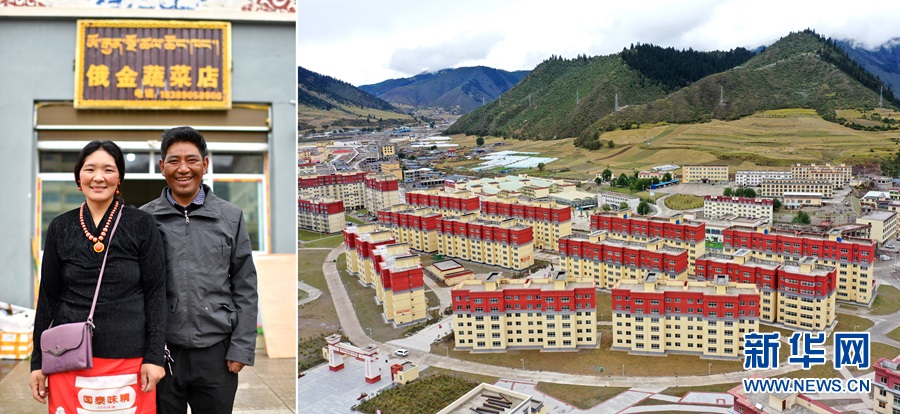 2020年9月22日拍攝的拼版照片:左圖為西藏自治區(qū)昌都市類烏齊縣長毛嶺鄉(xiāng)達(dá)雄村村民俄金(右)和妻子阿丁在安置點俄金蔬菜店前;右圖為類烏齊縣桑多扶貧開發(fā)區(qū)易地扶貧搬遷安置點一角(無人機(jī)照片)。新華社記者詹彥攝