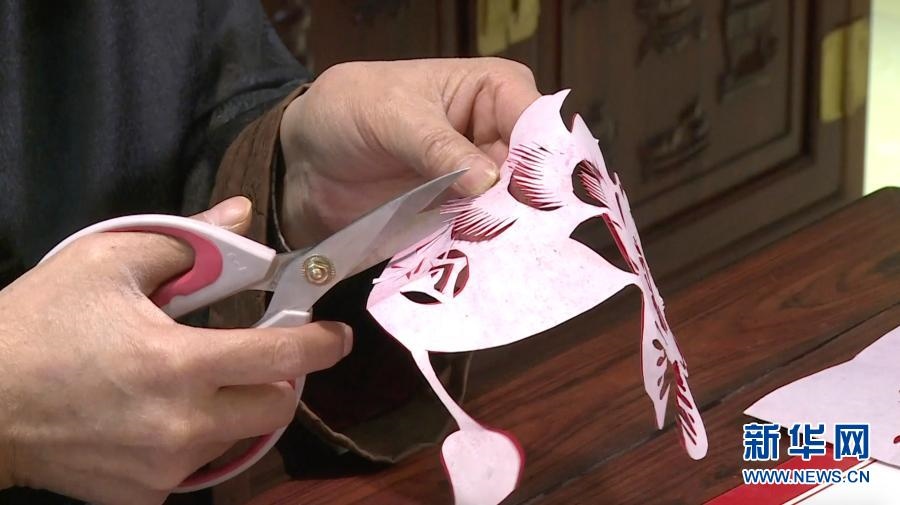 2月9日,“北京剪紙”非物質(zhì)文化遺產(chǎn)傳承人徐陽(yáng)在書桌前剪紙,喜迎新春(視頻截圖)。新華社發(fā)