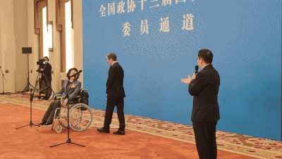 △首場“委員通道”活動(dòng)上,中國美協(xié)主席范迪安推著中國殘聯(lián)主席張海迪退場。(總臺(tái)央視記者魏毅拍攝)