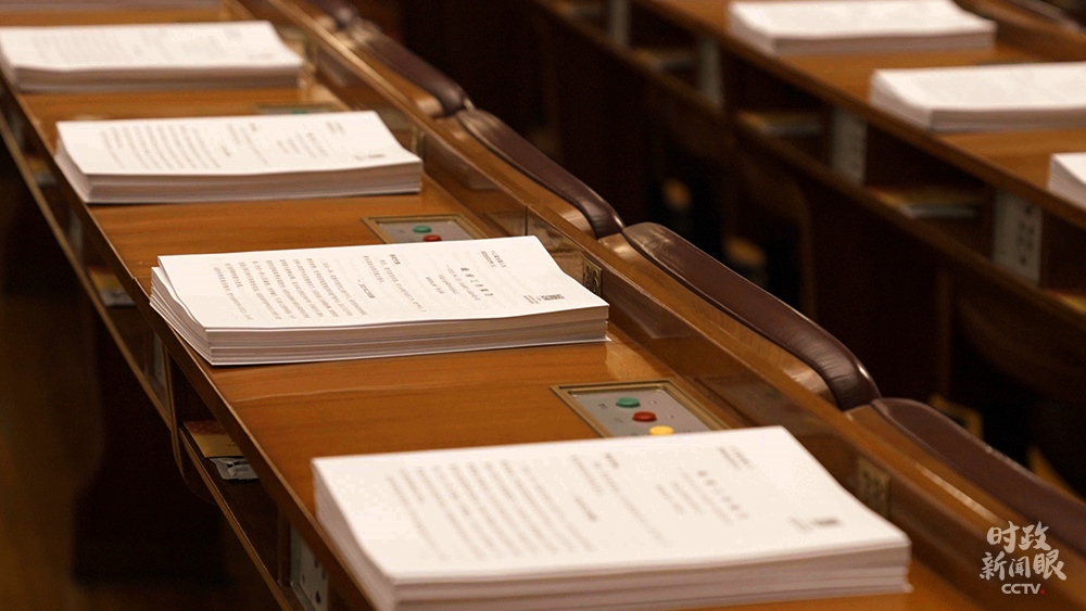 △擺放在代表座位上的政府工作報(bào)告等文件(總臺央視記者彭漢明拍攝)
