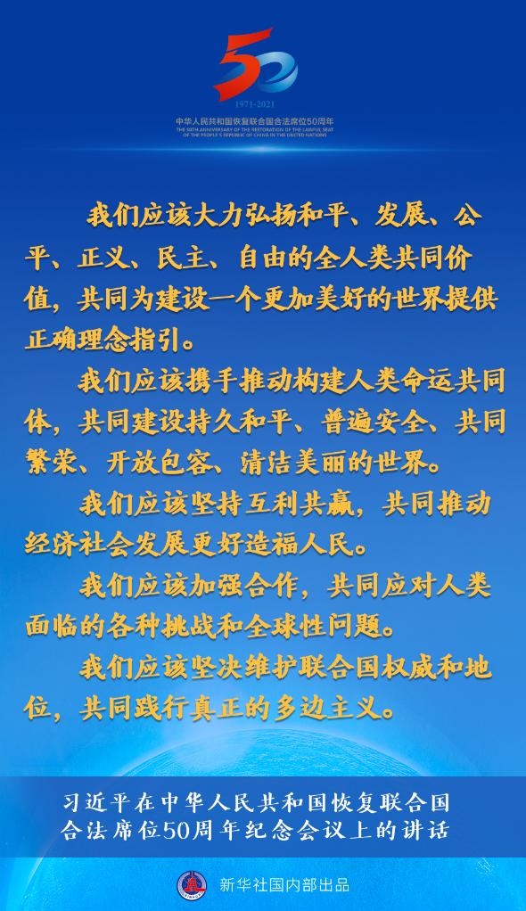 2021年10月25日,國家主席習(xí)近平在北京出席中華人民共和國恢復(fù)聯(lián)合國合法席位50周年紀(jì)念會議并發(fā)表重要講話。新華社記者李響攝