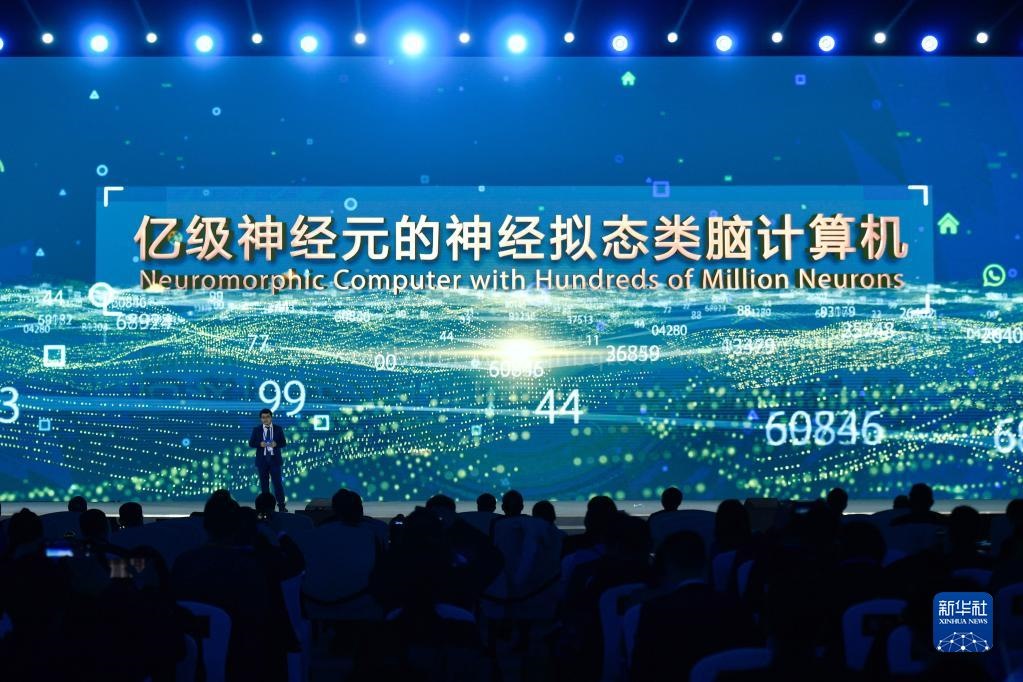 浙江大學(xué)、之江實驗室代表在“世界互聯(lián)網(wǎng)領(lǐng)先科技成果發(fā)布”活動上介紹“億級神經(jīng)元的神經(jīng)擬態(tài)類腦計算機”(2020年11月23日攝)。新華社記者 黃宗治 攝