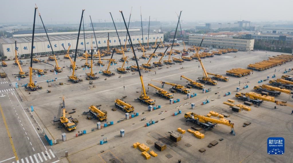這是2019年4月4日在徐工集團(tuán)徐州重型機械有限公司拍攝的調(diào)試中的起重機(無人機照片)。新華社記者 李響 攝