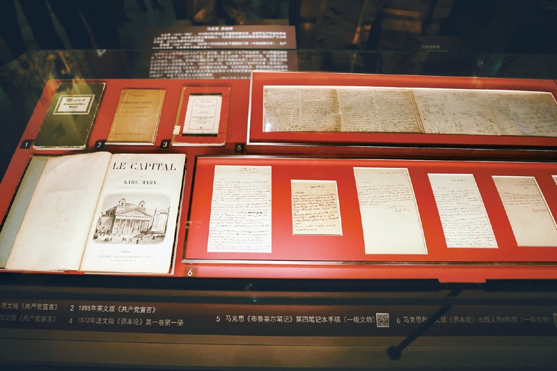 中國(guó)共產(chǎn)黨歷史展覽館的展廳里,陳列著多份珍貴的馬克思手稿。右上為馬克思《布魯塞爾筆記》第四筆記本手稿;右下為馬克思寫(xiě)給《資本論》法文版出版人的六封書(shū)信?!≈行律绨l(fā) 陳曉根/攝